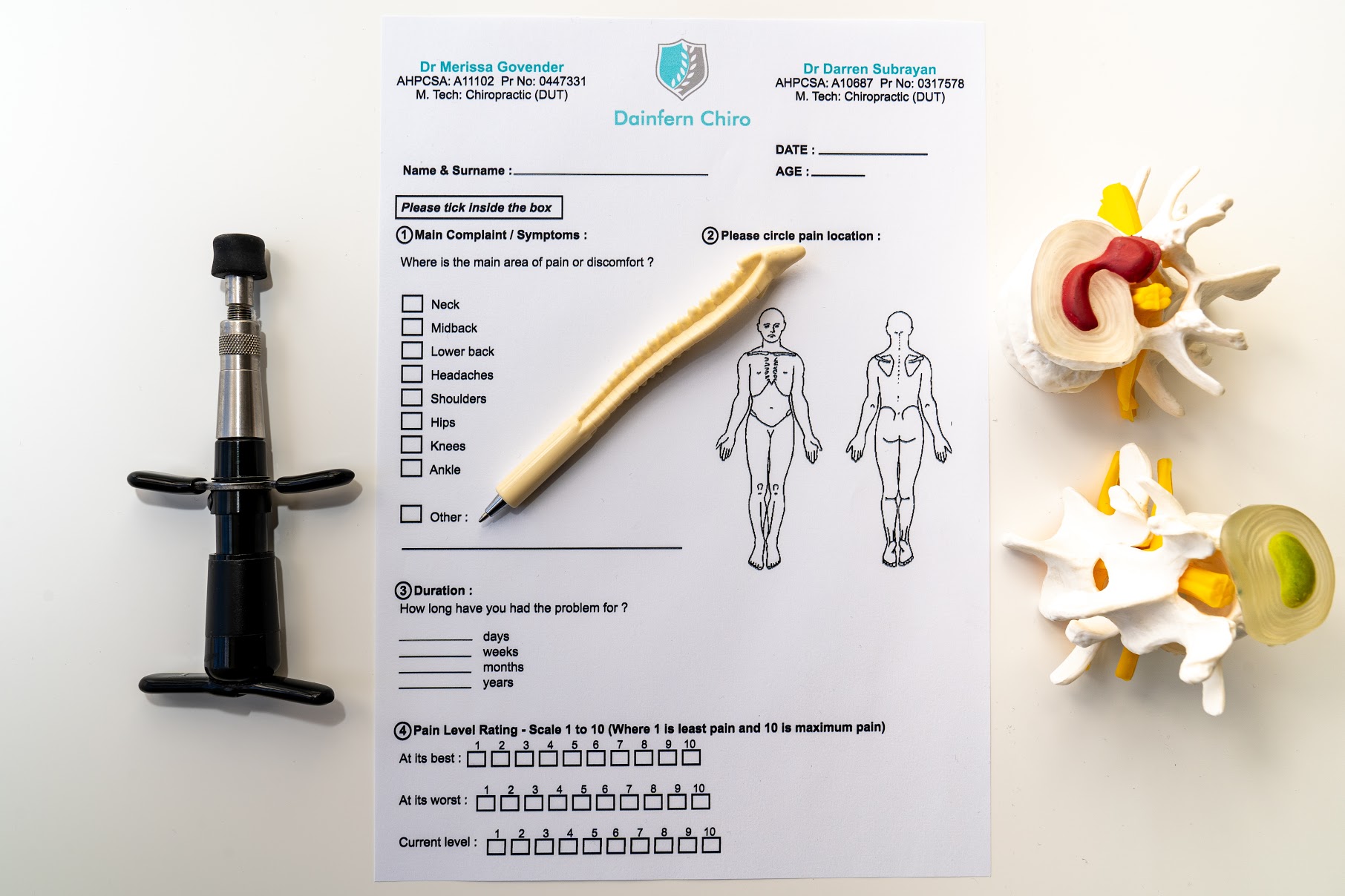 Your medical history and that of your family, past and present. Aches, pains, dysfunction, known mobility issues, traumas, accidents, and symptoms are recorded on a timeline. Key health factors are also discussed and noted to cover all major systems of the body. All patient forms are completed 48hrs before your session so that the Chiropractor can analyse your case and prepare thoroughly in advance for your initial consultation.