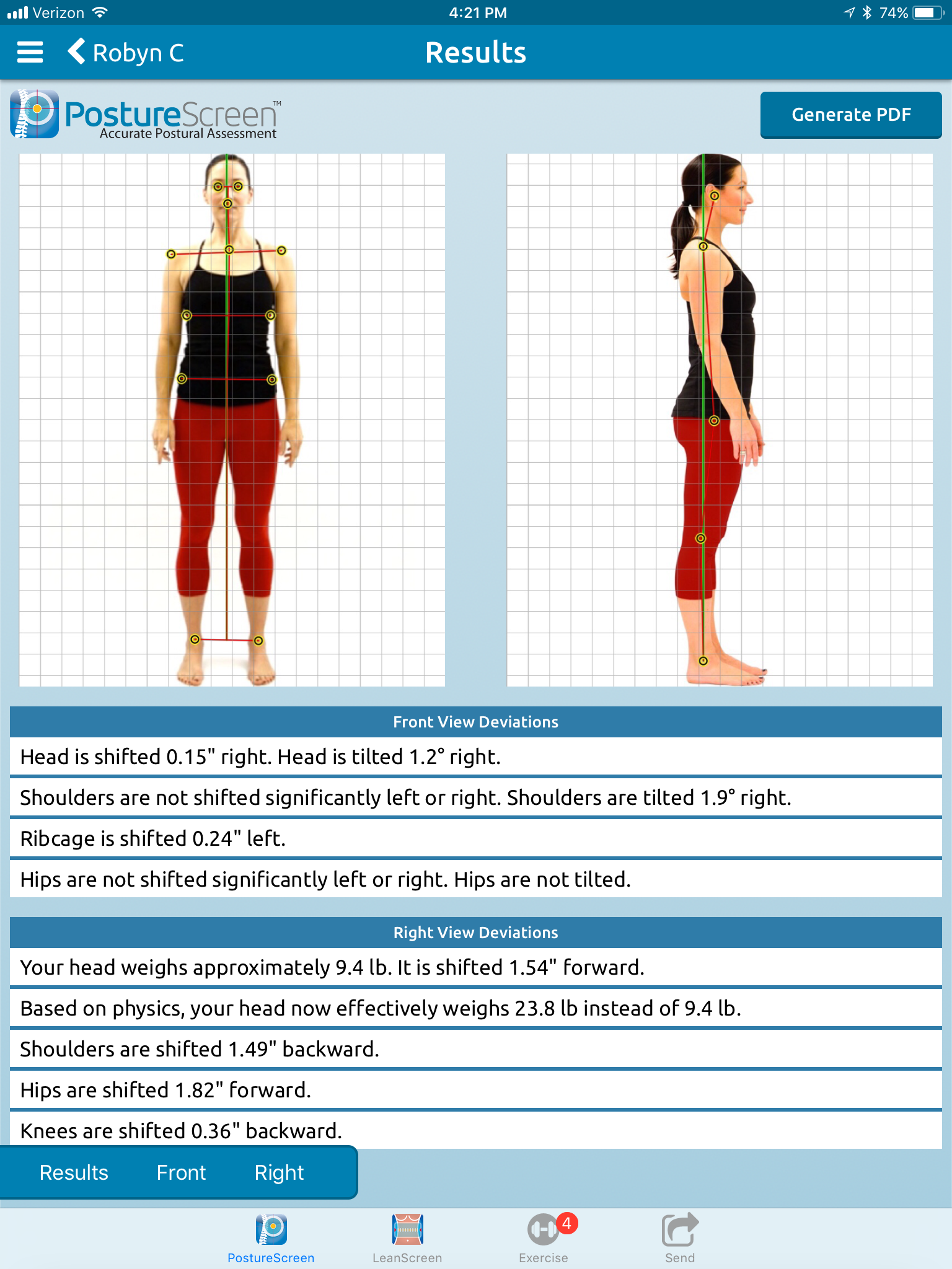A set of 4 high-resolution pictures are taken of your posture from the front and from the side using a dedicated tablet. Special software analyses the images and creates a detailed and objective report showing degrees of deviation from the expected normal.